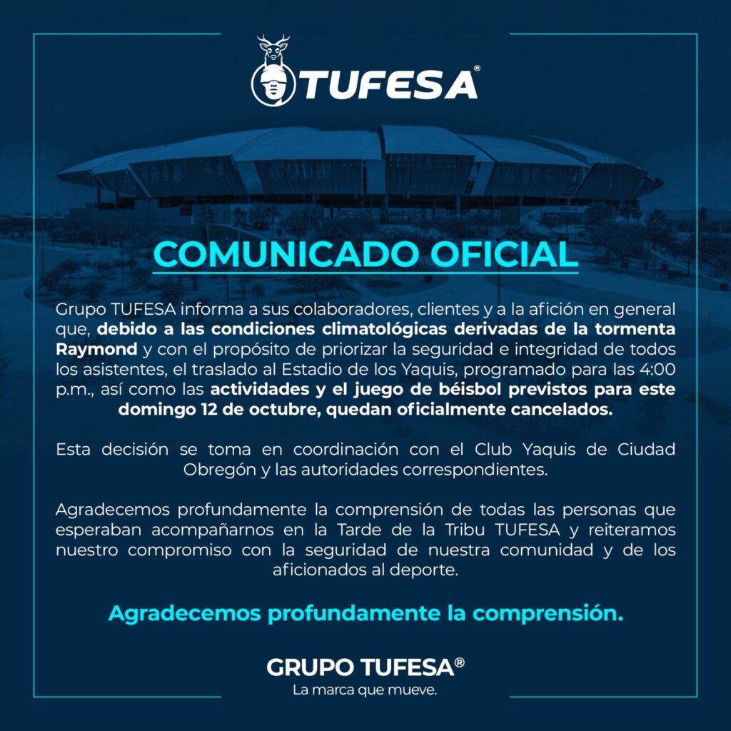 El Grupo TUFESA anunció la cancelación oficial de las actividades programadas en el Estadio Yaquis de Ciudad Obregón, debido a las condiciones climatológicas adversas provocadas por el ciclón tropical “Raymond”, que ha generado lluvias intensas en la región sur de Sonora. La medida fue tomada con el fin de garantizar la seguridad e integridad de todas las personas involucradas.