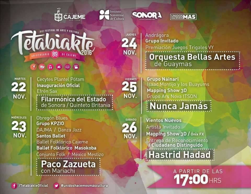 Durante la celebración del festival Tetabiakte se conmemorará el 89 aniversario de la fundación del municipio de Cajeme, con diferentes espectáculos de danza, música, poesía, pintura, ruta del arte, batucadas, bel canto y eventos infantiles, actividades que serán totalmente gratuitas.