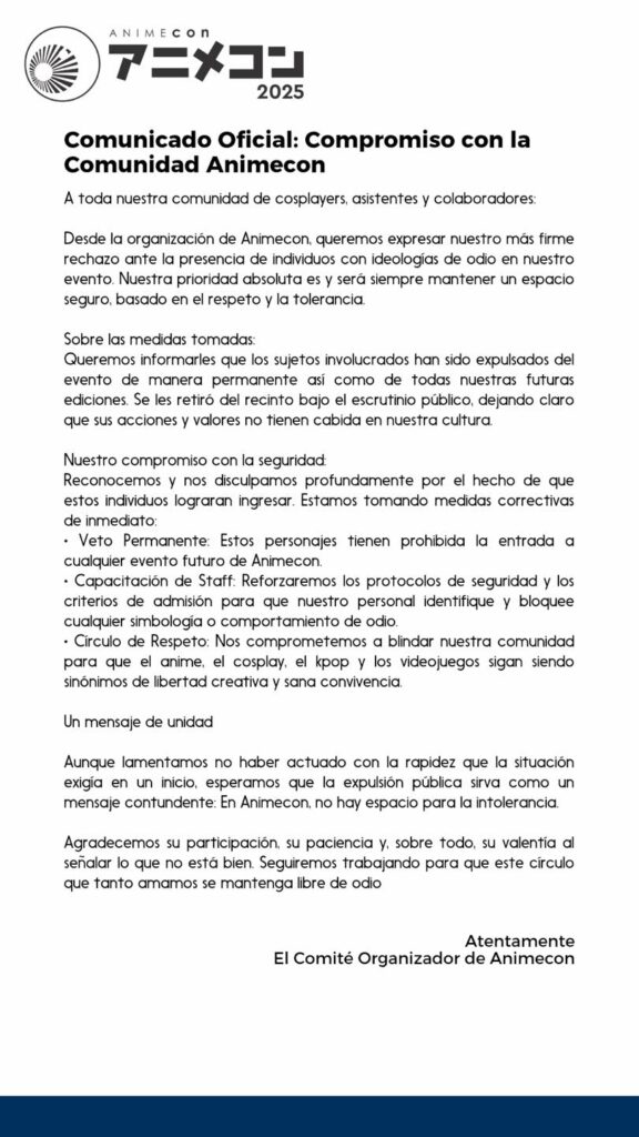 Sin embargo, no todo fue celebración. Horas después del evento, las páginas oficiales de Animecón difundieron un comunicado que encendió la conversación digital: se confirmó la presencia de individuos con ideologías de odio, quienes fueron identificados, expulsados del recinto y vetados de manera permanente de futuras ediciones.