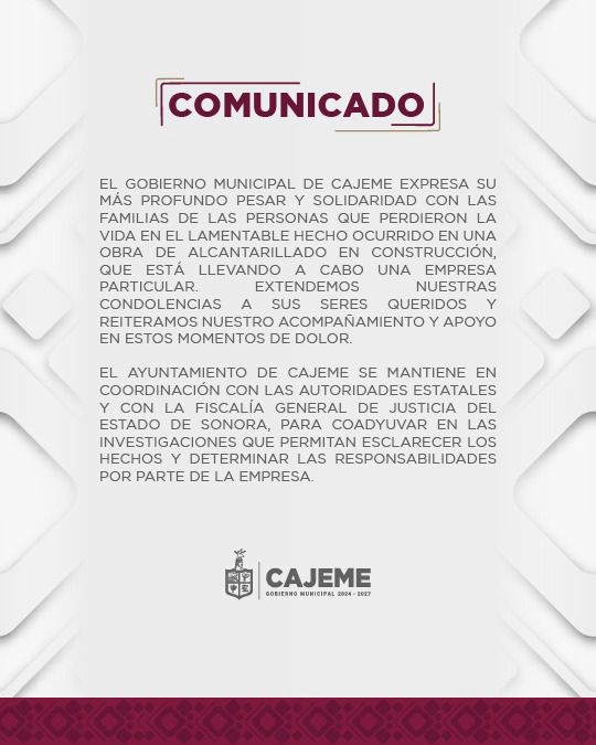 El Gobierno Municipal de Cajeme expresó su más profundo pesar y solidaridad con las familias de las personas que lamentablemente perdieron la vida en un incidente ocurrido durante los trabajos de una obra de alcantarillado en construcción, desarrollada por una empresa particular.
