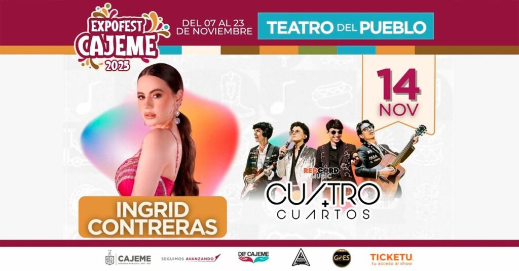 La música hecha en casa tendrá un lugar especial en la ExpoFest Cajeme 2025, y los cajemenses podrán disfrutar de una velada llena de emoción, talento y orgullo local con la presentación de Ingrid Contreras y el grupo Cuatro Cuartos, quienes se presentarán el próximo 14 de noviembre en la explanada del Auditorio de las Estrellas.