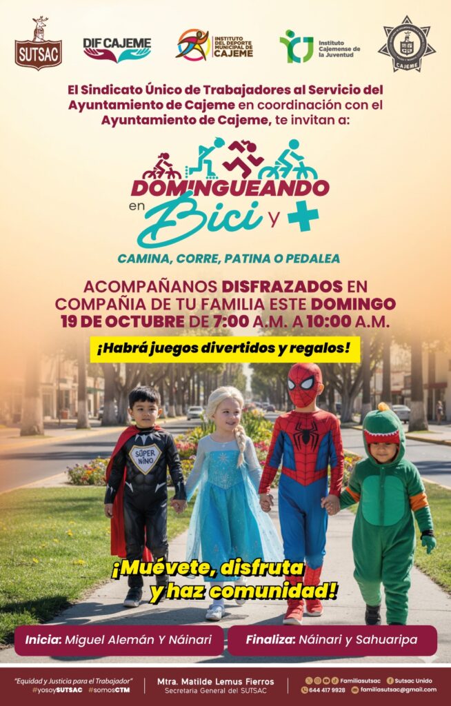 Así que ya lo sabes: este domingo 19 de octubre, saca tu bici, tus patines o tus tenis, disfrázate y únete a esta gran experiencia familiar. En Cajeme seguimos promoviendo la convivencia y la vida saludable, porque aquí compartimos siempre las noticias que vale la pena conocer.