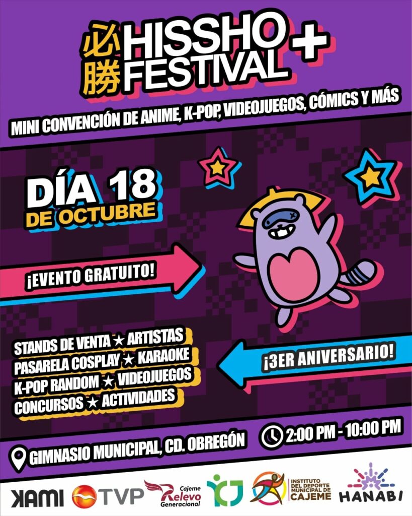 El talento, la creatividad y la pasión por la cultura geek volverán a llenar de color el Gimnasio Municipal de Ciudad Obregón con la llegada del Hissho Festival 2025, una mini convención de anime, K-POP, cómics y videojuegos que celebra su tercer aniversario este 18 de octubre, de 2:00 p.m. a 10:00 p.m.