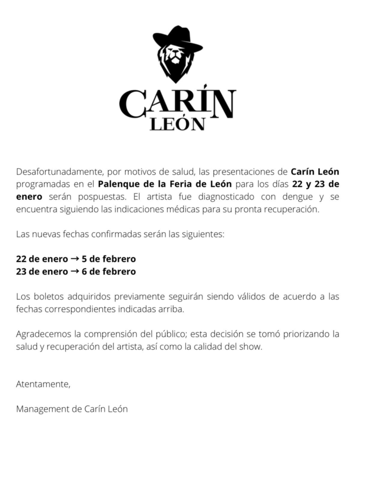 En el comunicado, el management de Carin León señaló que el artista se encuentra siguiendo indicaciones médicas estrictas para su pronta recuperación, destacando que los boletos adquiridos previamente seguirán siendo válidos para las nuevas fechas, lo que busca brindar certeza a quienes ya contaban con su acceso al evento.