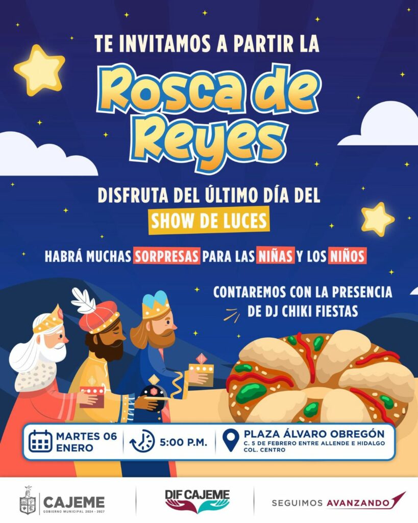 En Cajeme, esta tradición se vive de manera especial. El Gobierno Municipal y DIF Cajeme invitan a las familias a partir la Rosca de Reyes y disfrutar del último día del espectáculo “Cajeme se Ilumina”, en un ambiente pensado para niñas, niños y adultos.