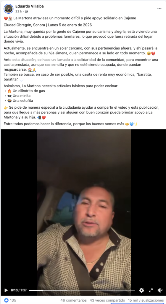 En el mismo post, Villalba solicitó apoyo a la ciudadanía de Cajeme para conseguir una casita prestada o una renta muy económica. Además, difundió una lista de artículos básicos que la propia Martina habría pedido para poder cocinar: un cilindro de gas, una estufita y una “minita”, cerrando con la frase: “Entre todos podemos hacer la diferencia, porque los buenos somos más”.